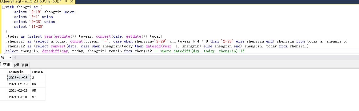 sql="select count(*) as ttshu from shengri where (user="&session("user")&" and gongnong=0 and DateDiff(day,getdate(),dateadd(year,DateDiff(year,birthday,getdate()),birthday))between 0 and 14) or (user="&session("user")&" and gongnong=1 and shengrin<>'2-29' and shengrin<>'2-30' and (case when shengrin in ('2-29', '2-30') then '2-28' else shengrin end)and DateDiff(day,'"&(jinnongli)&"',dateadd(year,DateDiff(year,nongli,'"&(jinnongli)&"'),nongli))between 0 and 14)"