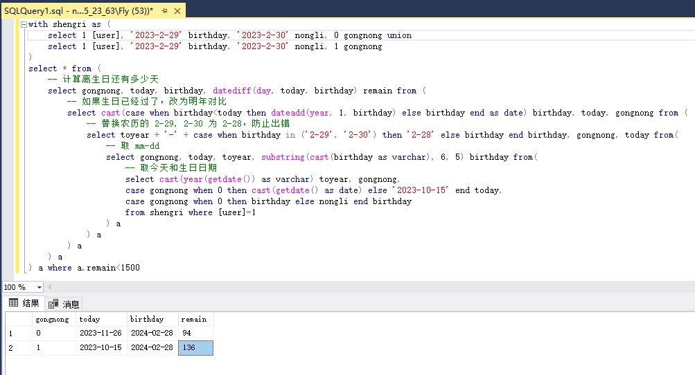 sql = "select count(0) from (select gongnong, today, birthday, datediff(day, today, birthday) remain from (select cast(case when birthday<today then dateadd(year, 1, birthday) else birthday end as date) birthday, today, gongnong from (select toyear + '-' + case when birthday in ('2-29', '2-30') then '2-28' else birthday end birthday, gongnong, today from(select gongnong, today, toyear, substring(cast(birthday as varchar), 6, 5) birthday from(select cast(year(getdate()) as varchar) toyear, gongnong, case gongnong when 0 then cast(getdate() as date) else '"& jinnongli &"' end today, case gongnong when 0 then birthday else nongli end birthday from shengri where [user]="&session("user")&") a) a) a) a) a where a.remain<15"